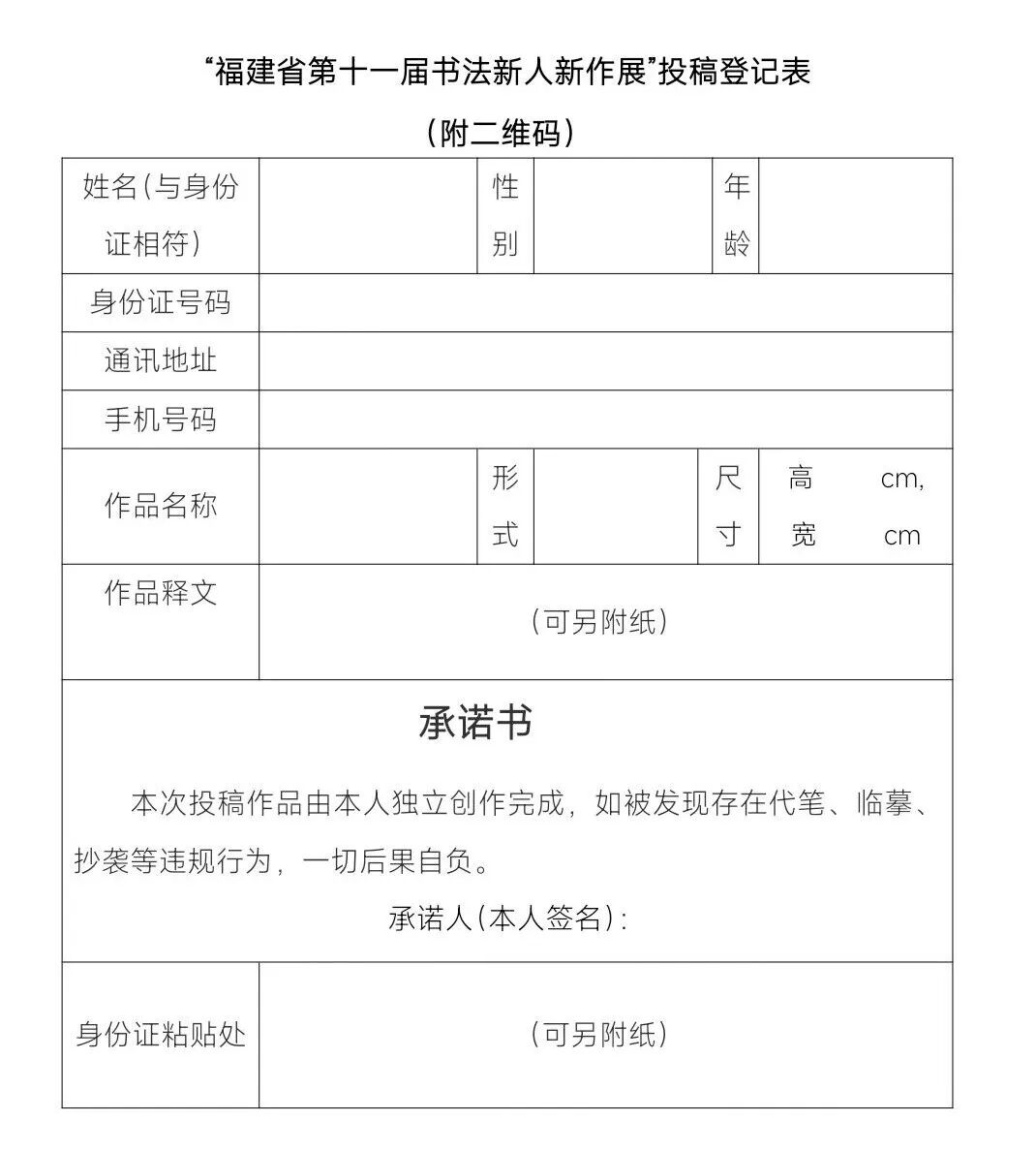 2.详细填写《福建省第十一届书法新人新作展投稿登记表》(附后、线上填写并提交),投稿登记表、身份证复印件、作品释文、书写内容使用的版本复印件随作品一并寄出。