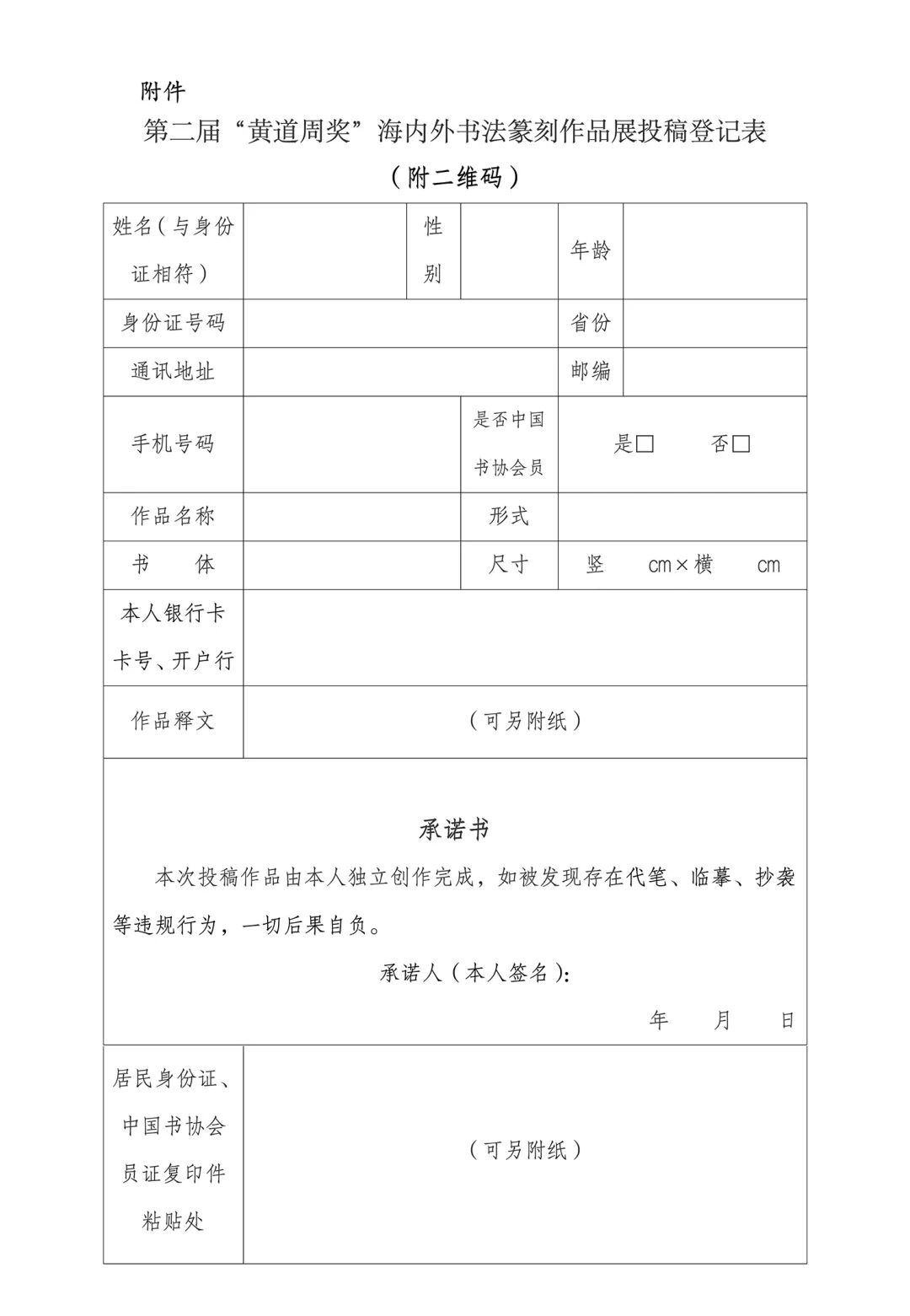 5.信息填写:在作品背面右下角用铅笔正楷注明:作者真实姓名、性别、身份证号、常用通讯地址、邮编、联系电话(固定电话、手机)、作品名称、作品规格、作品书体等。同时填写《第二届“黄道周奖”海内外书法篆刻作品展投稿登记表》,连同身份证复印件、作品释文以及创作内容使用的版本复印件,随作品一并寄出。