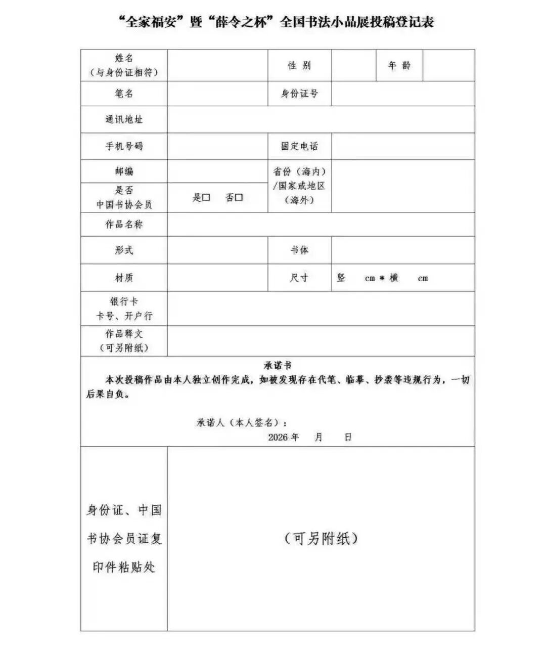附件:“全家福安”暨“薛令之杯”全国书法小品展投稿登记表
