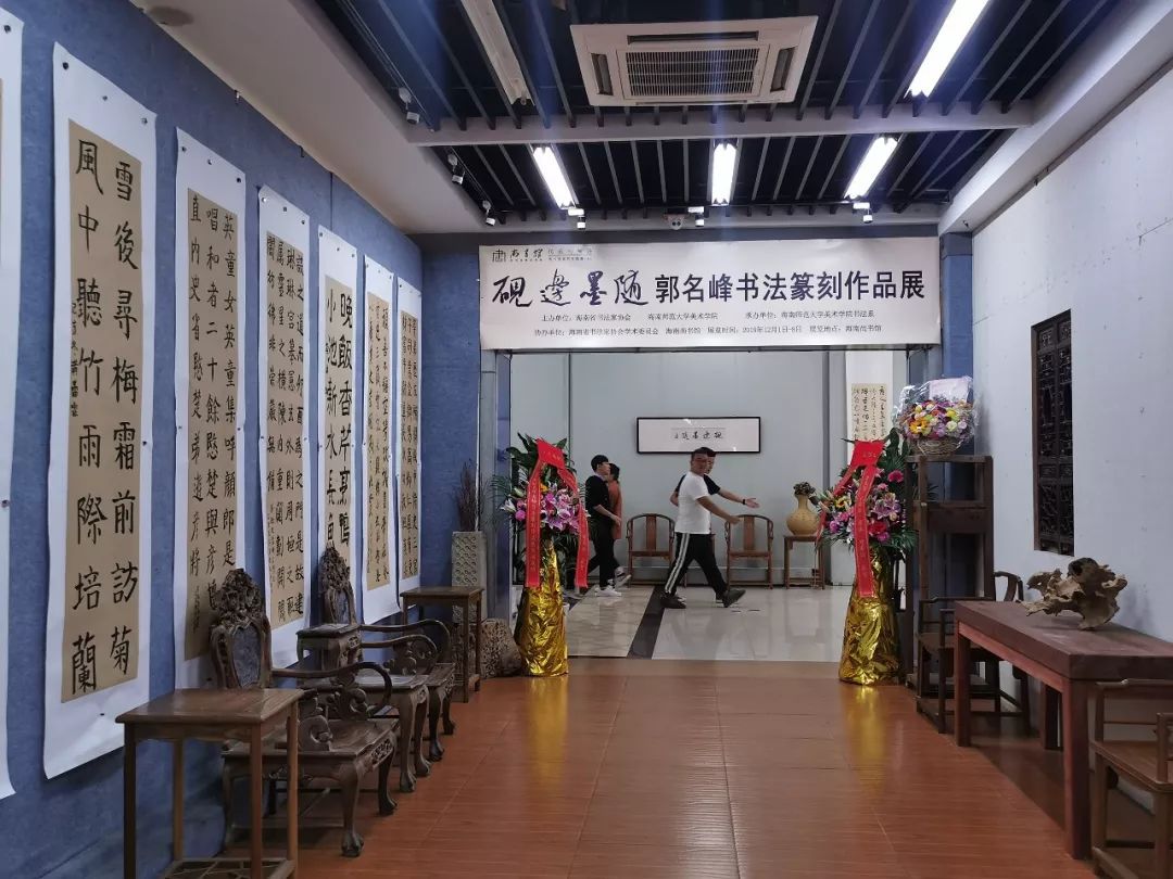 2019年12月1日上午9点,“砚边墨随——郭名峰书法篆刻作品展”开幕式在海南尚书馆隆重举行。此次展览由海南省书法家协会和海南师范大学美术学院主办、海南师范大学美术学院书法系承办、海南省书法家协会学术委员会和海南尚书馆协办。