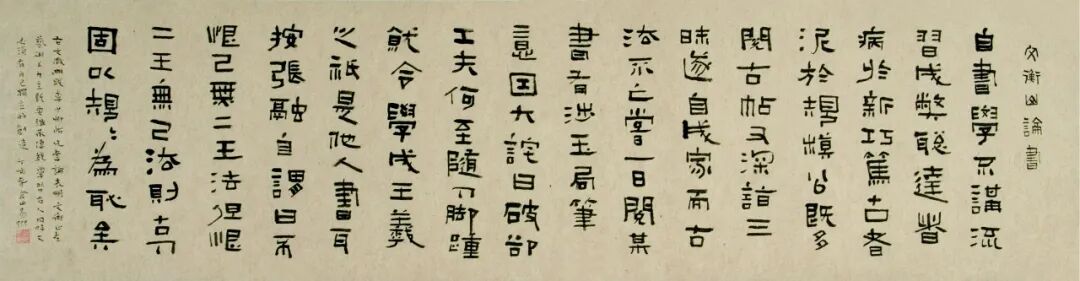 在学的过程中,古人在书法几千年传承发展中总结了很多经验,这些经验往往已经积淀到他们留下来的文字当中。所以我们学书法的,要看看孙过庭的《书谱》、刘熙载的《艺概》这些前人总结性的东西。这些经验不是一年两年得来的,而是总结了前人历代学习书法的好的经验、好的做法。聪明的人、善于学习的人,肯定要借鉴古人的经验,要站在巨人的肩膀上。古人都很聪明的,虽然我们现在科技发达了,但实际上在某些方面的思维方式未必超越古人。书法本身是跟文字相关的艺术,身处科技时代的我们肯定无法跟古人相比。他们每天拿着毛笔当作日常书写工具,一天可能要写十几个小时,我们现在不可能了,一般的上班族都做不到,每天能够有一小时的临摹已经蛮好了。所以古人的这些先进经验不要轻易放过,一定要从里边吸收营养。