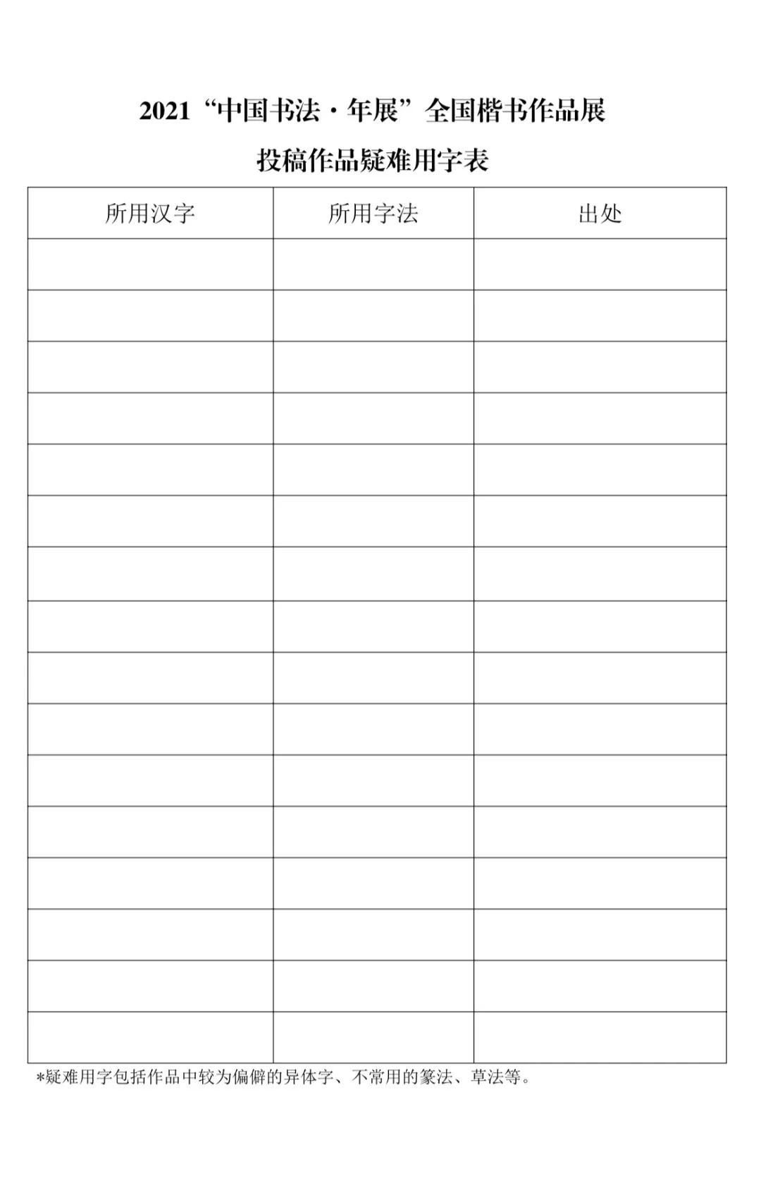(3)为便于准确登记,及时联系投稿作者,请认真填写《2021“中国书法·年展”全国楷书作品展投稿登记表》《2021“中国书法·年展”全国楷书作品展投稿作品疑难用字表》(启事后附表格,可复印使用,也可从中国书法家协会网站http://www.ccagov.com.cn、中国书法出版传媒网站http://www.zgsfcbcm.com、《中国书法报》网站http://www.zgsfbs.cn、中国书法出版传媒微信平台、书法出版社微信平台、《中国书法报》微信平台、《中国书法》杂志微信平台下载),连同身份证复印件、退稿费汇款单复印件、书写内容使用的版本复印件,随作品一并寄出。