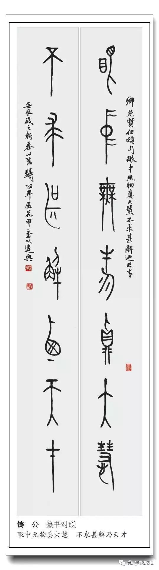 虽然篆书仍是大众和一些学书者陌生的字体,但它承载着的巨大文化信息与书法精神,受到学者与书家们的尊重与喜爱。普及篆书并加强对它的学习,不仅可增强人们对汉字字源、字形、字义、字音的了解,也可对中国历史和书法史加深认识,特别对古汉语文字、先秦文献、音韵训诂、历史考古的研究及学科人才的培养,有重要的作用和意义。当然书家能兼擅篆书、篆刻则更难能可贵。
