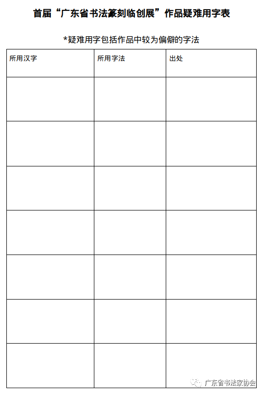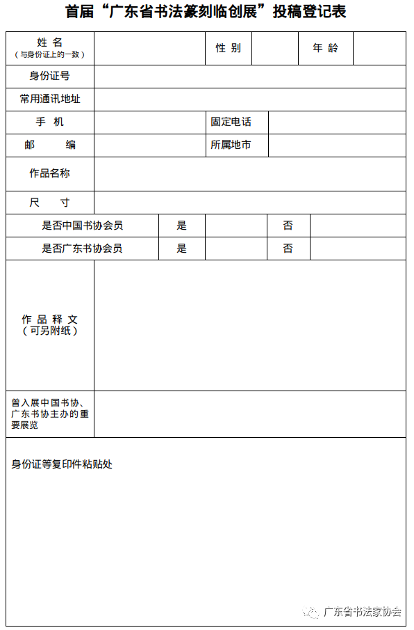(2)为便于准确登记,及时联系作者,请认真填写《首届“广东省书法篆刻临创展”投稿登记表》、《首届“广东省书法篆刻临创展”投稿创作作品疑难用字表》(启事后附表格),连同身份证、中国书协会员证、省书协会员证复印件、所临碑帖复印件、作品释文和创作内容使用的版本复印件,随作品一并寄出。