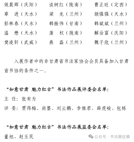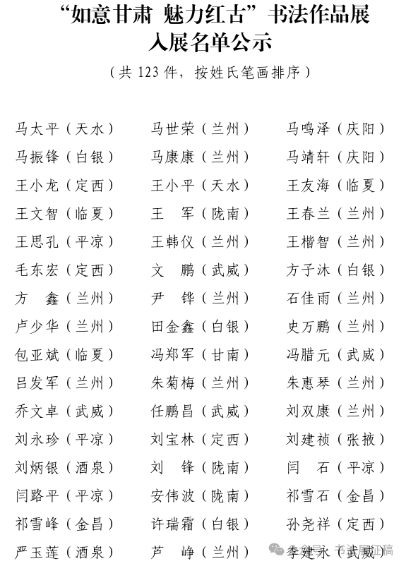 现将入展作者名单予以公示,公示期为2025年12月26日—2023年1月1日,共7天。公示期间,如发现代笔等违规现象,可向甘肃省书协办公室举报、反馈。举报、反馈材料要求信息准确,事实清楚,甘肃省书协将依规调查、核实、处理。